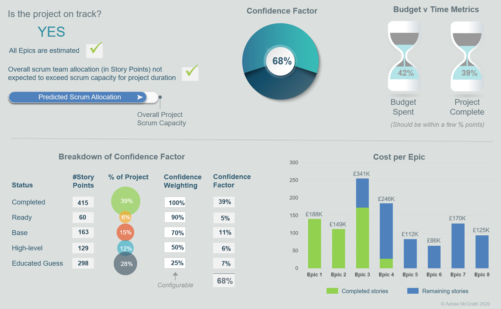 In the example above, 4 sprints in, there is only a 55% Confidence that the project is on track as there are too many Epics/Features/User Stories that are estimated at “High-Level” and “Educated Guess”. This is to be expected in the early stages of an Agile project. However, at least there is a view as to how long the project could take, a view that is acknowledged will change as the project progresses and more requirements are captured, adding greater precision into the Product Backlog. Therefore, the degree of confidence about whether the project can be complete within the designated timeframe will naturally increase with every sprint.