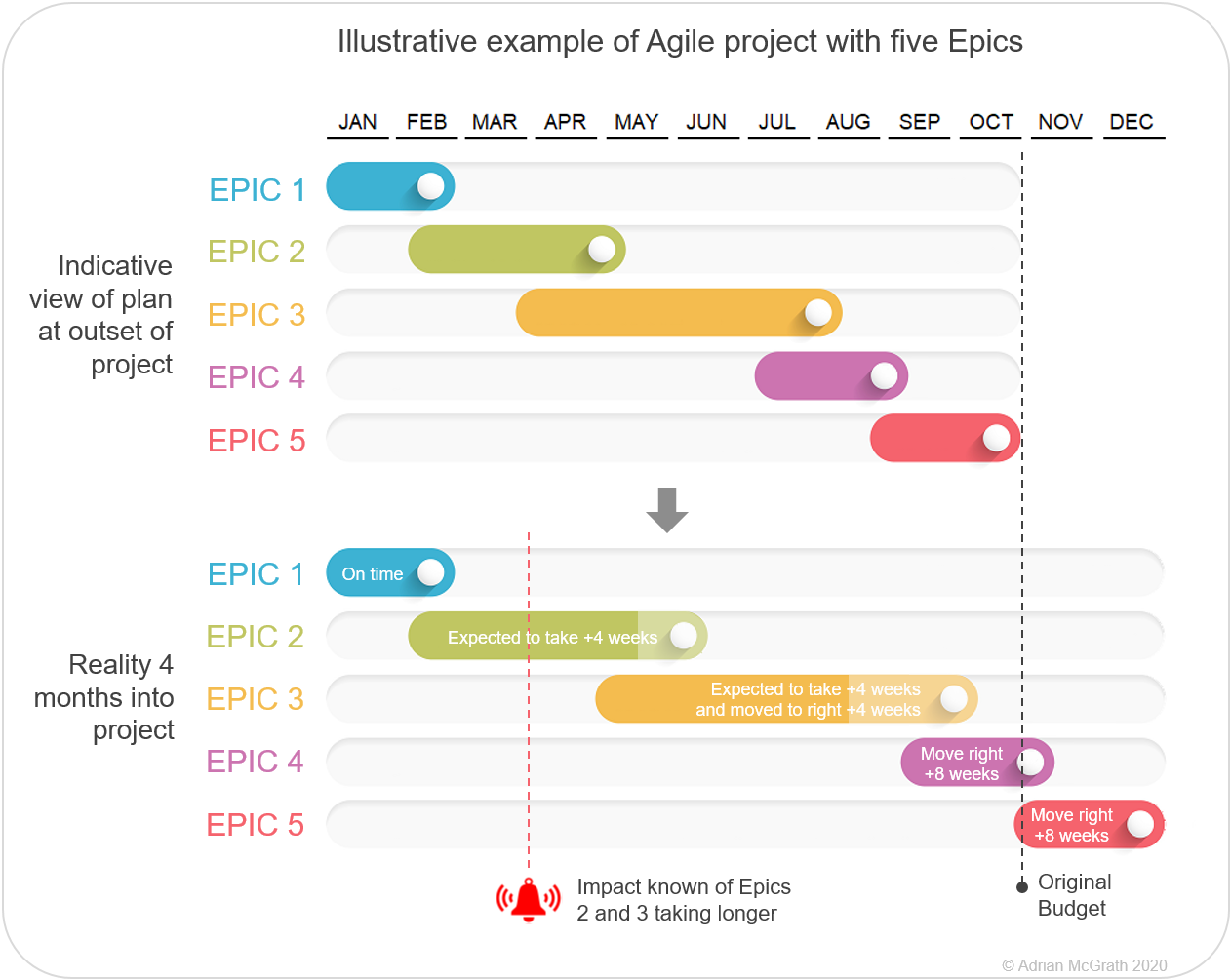 This point is perhaps best illustrated by example. Let’s assume an Agile project has 5 Epics. At the outset of the project when funding was approved, the project may have been expected to play out over 9 months, with an indicative timeline for the Epics laid out (as part of the due diligence behind the investment).