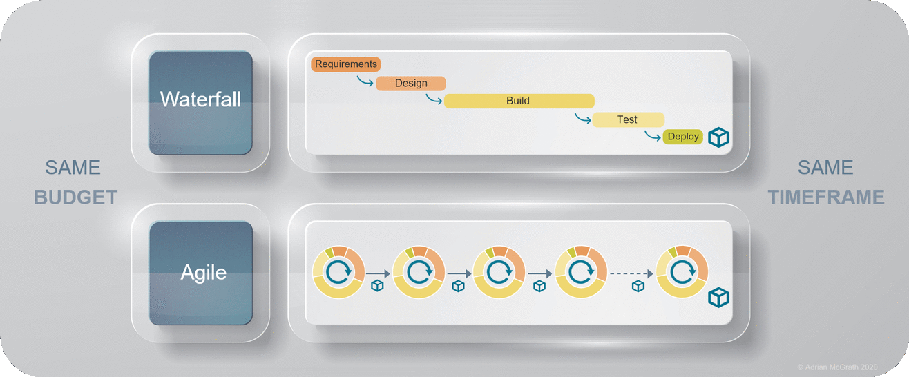 A key “how” decision then made at the outset of a project is what implementation approach to use, with Agile increasingly becoming the de facto choice over the more traditional Waterfall. Agile projects will sometimes achieve the end-goal outcome faster and at less cost than Waterfall, however, there should not be an expectation that it does. The real benefit of Agile is on achieving a better quality outcome and one that is more likely to deliver the business value expected. In this regards, let’s assume that the budget and timeframe is the same, irrespective of whether Waterfall or Agile is selected.