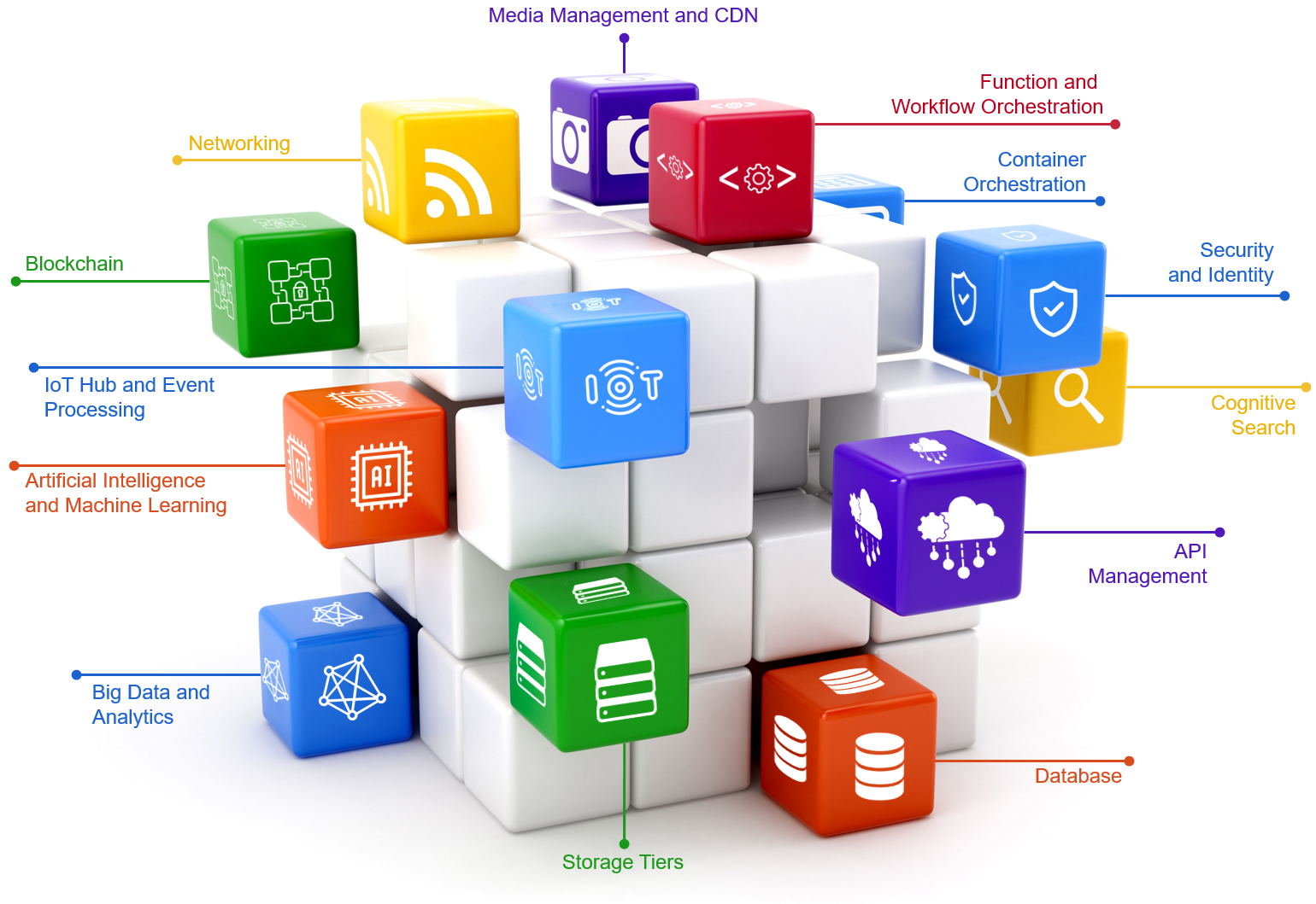 If you visualise an application as a cube, showing the individual building blocks that make up the application, then you can start to see where many of the blocks can be fulfilled by a variety of cloud services that span infrastructure (such as storage, compute and availability zones) and platform (such as API Management, Service Bus and Machine Learning). This concept is illustrated below.