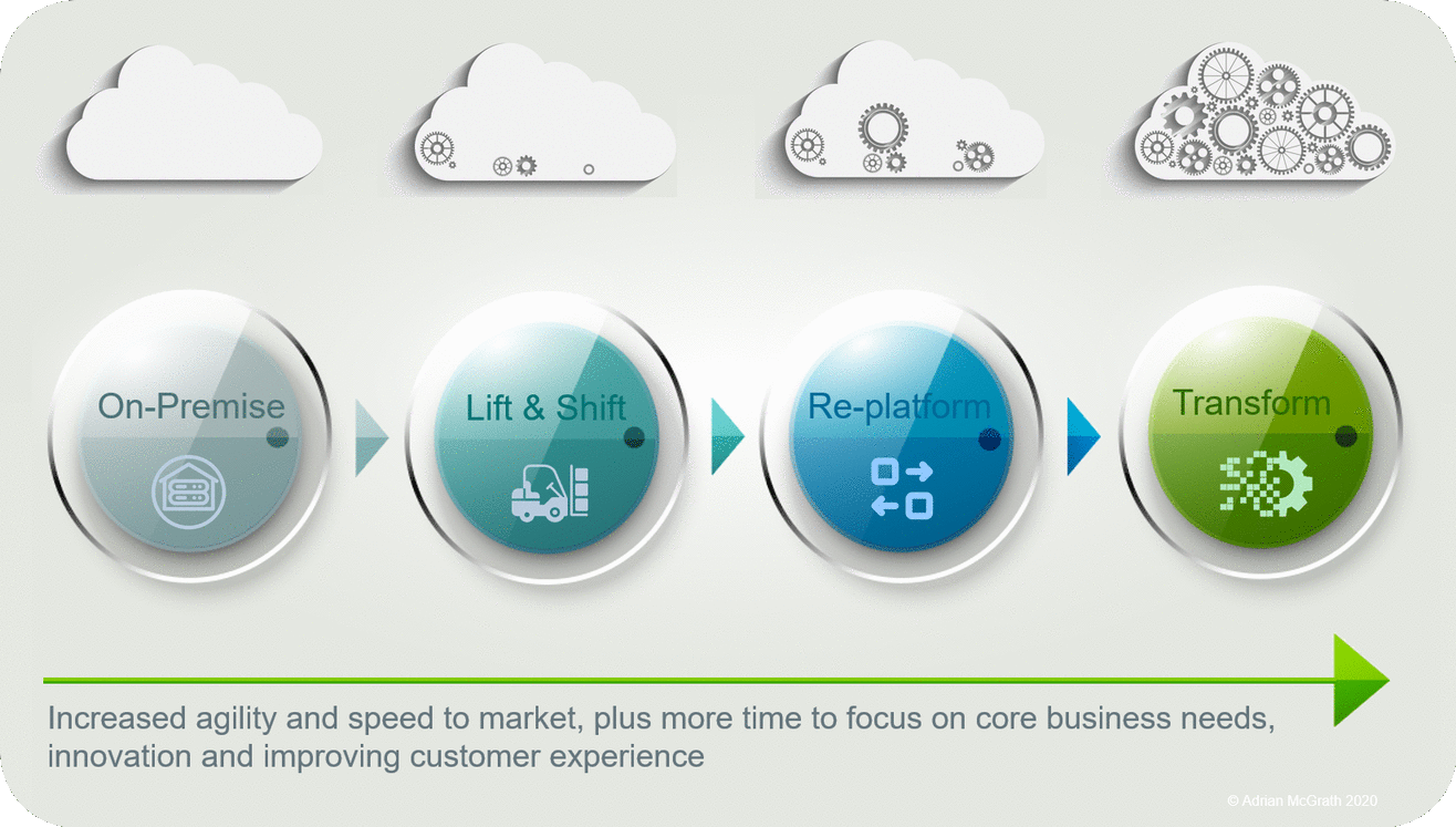 - Transform – This phase is focused on fully leveraging the platform services offered by the cloud and, for many older applications, will involve a re-architecture (modernisation) of the application so as to move towards a more modular, decoupled architecture. This will enable the application to utilise and broker platform services from the cloud to address business requirements rather than re-inventing them. The modernised applications will also be much more aware of the underlying cloud infrastructure and be designed to work across, and failover into, different availability zones.
