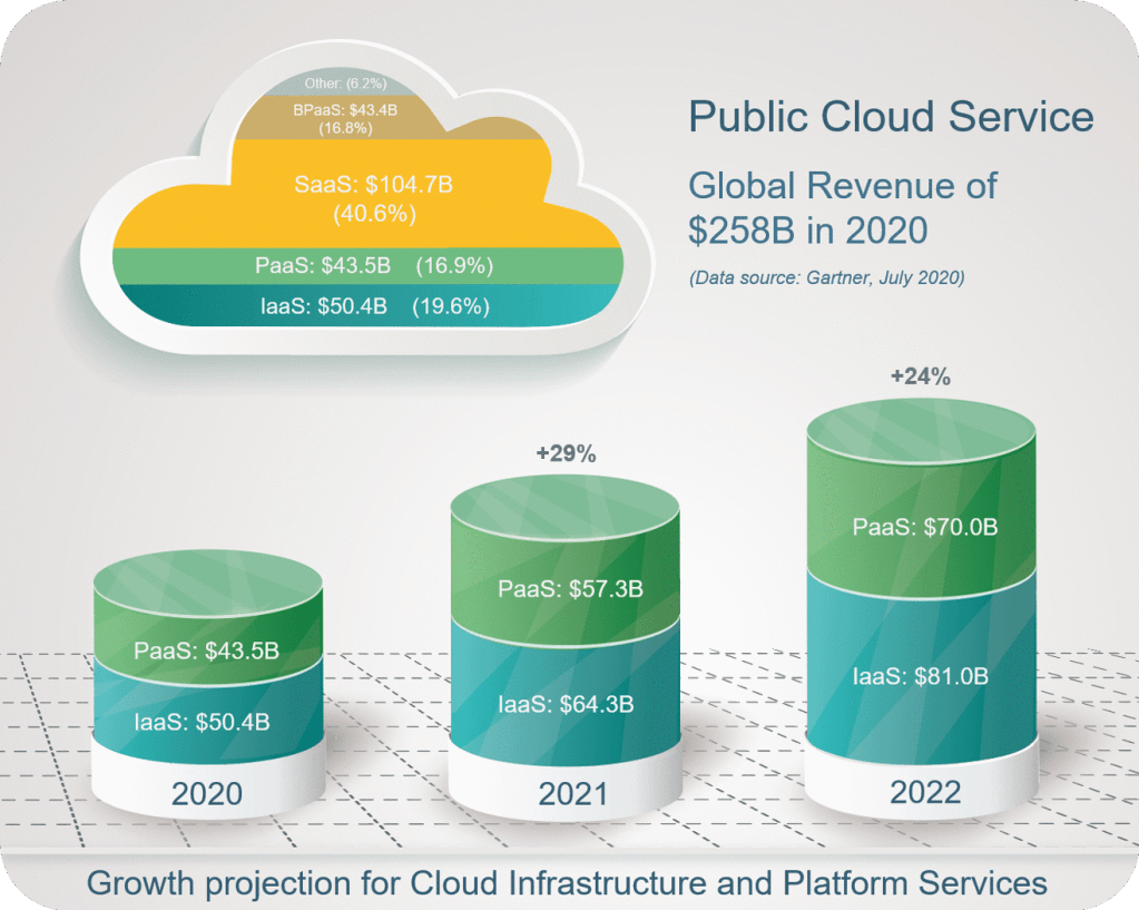 Being a core ingredient for Digital Transformation, this has fueled huge growth in the adoption of cloud, as illustrated in the figure below (using data from Gartner). The overall Public Cloud Service has seen revenues in the order of $260B in 2020, and this is expected to grow to $364B within a further two years. Although Software-as-a-Service (SaaS) takes the biggest chunk of the cloud market, the two biggest growth areas over the next two years are IaaS and PaaS, both expected to grow 62% and 66% respectfully by the end of 2022. This is compared to equivalent growth of SaaS in the same period of 34%.